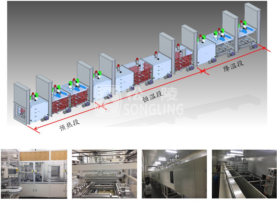 隧道式全自動真空烘烤線是根據客戶現有生產和工藝需要,專門開發的一款電池注液前烘烤的自動真空隧道式流水線;如果更換相關工裝夾具,同時也可以進行極卷的烘烤和電芯規格烘烤。